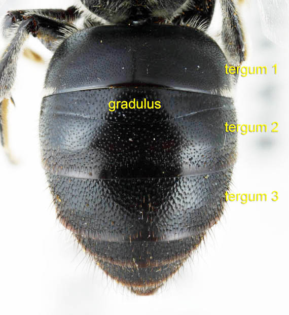 Each tergum, except, the first has a gradulus which is usually hidden beneath the tergum in front. In Meroglossa species the gradulus of tergum 2 is not hidden. (The plural of tergum is terga.)