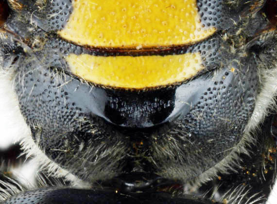 The dorsal surface of the propodeum of the female is polished with a small number of well-separated pits. She also has the gradulus of tergum 2 exposed. The male has deep depressions between the eyes and the antennal sockets.